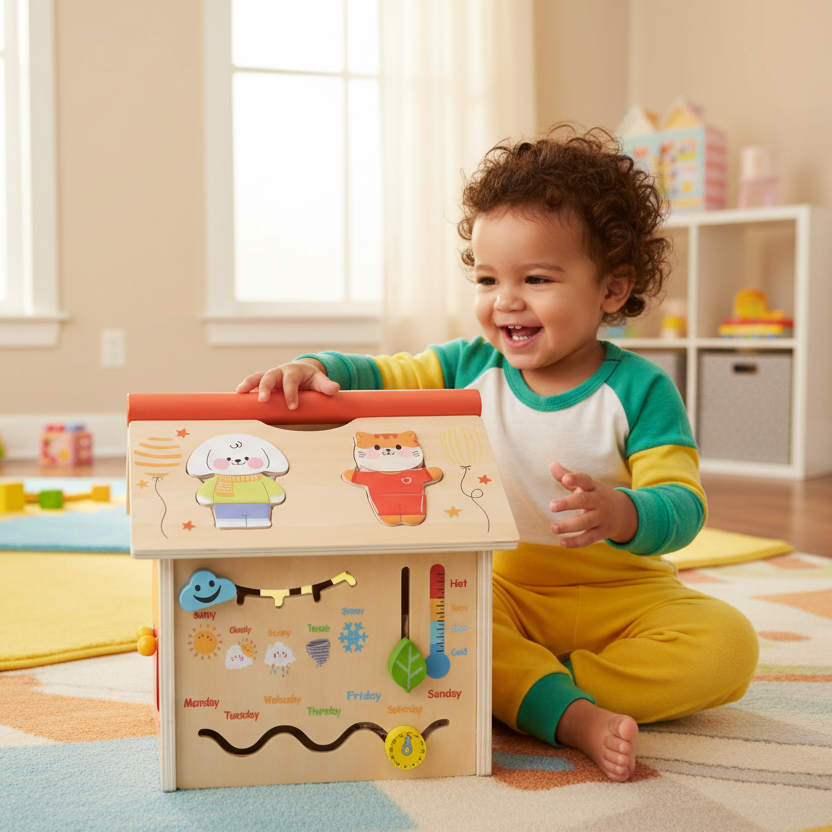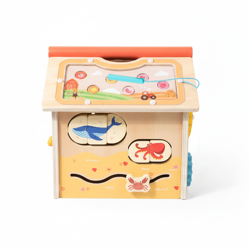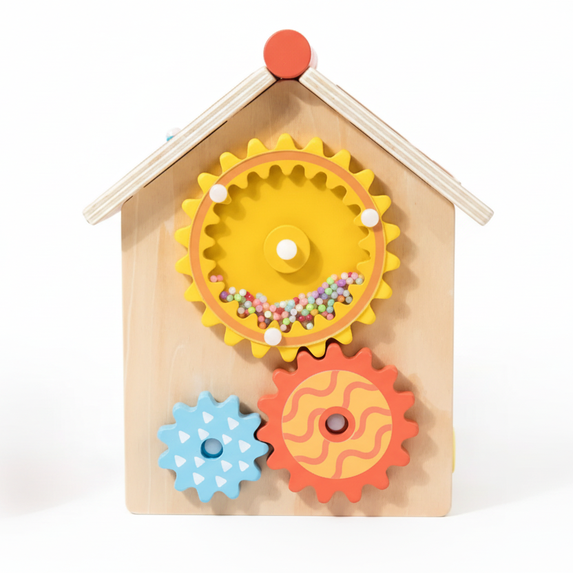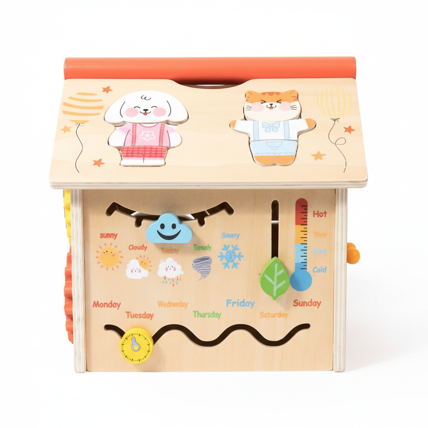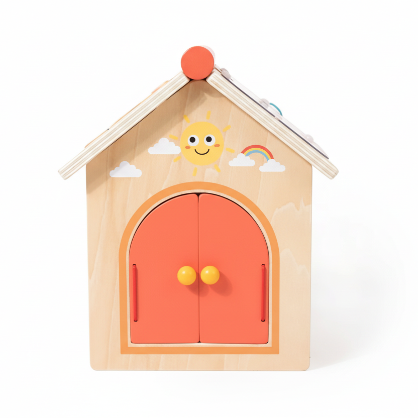 Spark curiosity, learning and imaginative play with this beautifully designed Wooden Activity House Busy Board, a multi-sensory educational toy created to support early childhood development. Packed with interactive features on every side, this activity house keeps little hands busy while gently building essential skills through play.